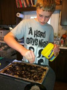 Colby returned from his father’s later than we planned, so I tidied up, drank coffee, watched Meet The Press and started my Statistics homework. He came home, we visited briefly, and he played music while I finished up. He stacked wood and I prepped the kitchen for a little creative culinary endeavor – homemade granola bars. Said endeavor lasted upwards of three hours and ended with a sink and dishwasher full of dirty dishes, about 4,000 jokes about me saying “OK, Colby. Now you need to process your nuts”, and Colby saving a chocolate glaze that turned. He then used the leftovers to craft what, at best, would be a spicy chocolate drink and at worst, a science experiment gone wrong. Matt was the only one brave enough to try it and, well, you remember that post about bravery, right?