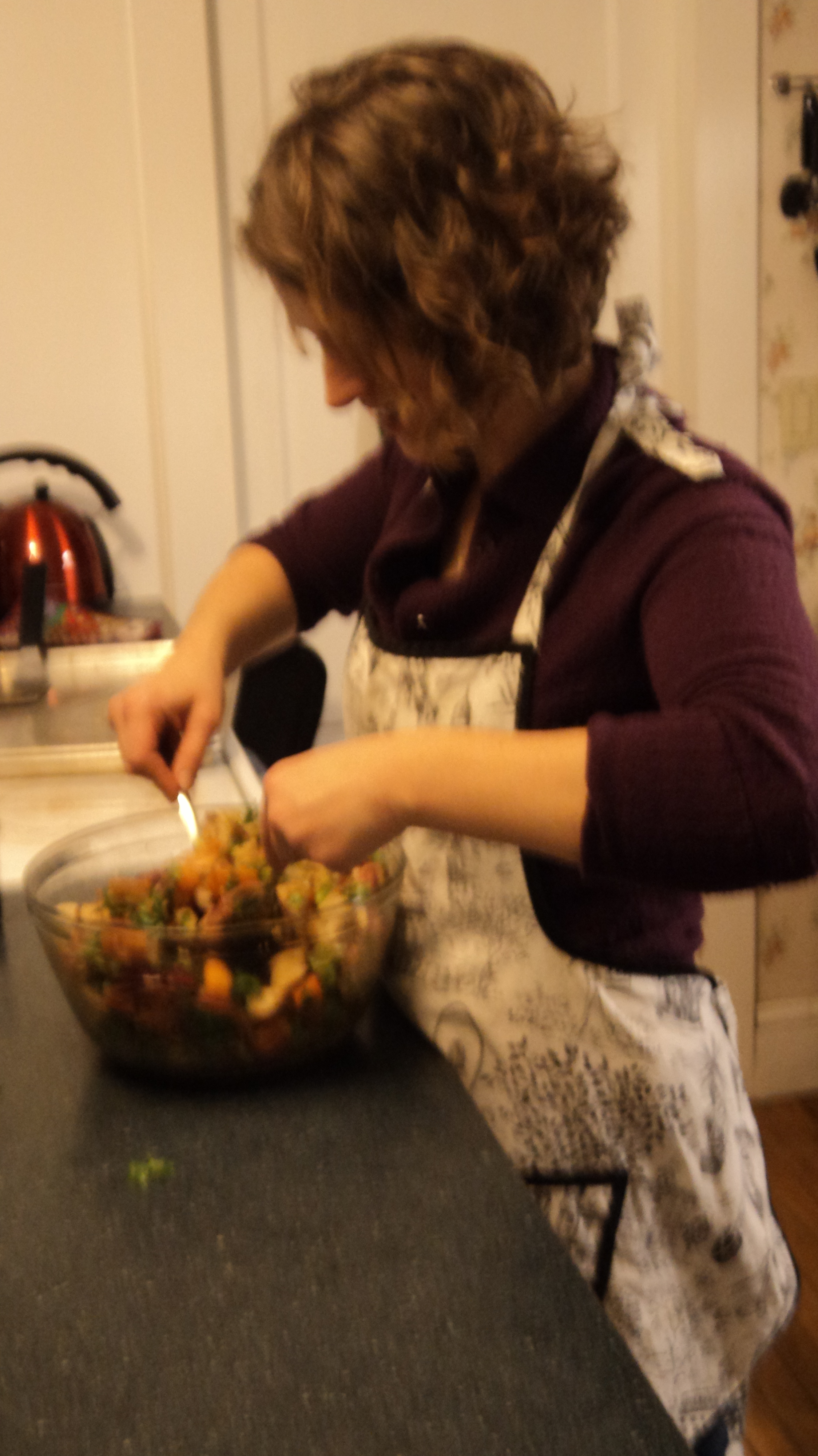 So I turned on my own music and poured a glass a wine and got down to business with a bag full of brussels sprouts after I made as many ‘balls in a bag’ jokes as I could. What I ended up with was a loose approximation of Smitten Kitchen’s take on Michael Chiarello’s Winter Panzanella. Smitten’s adaptation is great, but I made a few tweaks myself. In lieu of spending an hour cutting squash, I bought a pre-cut bag and halved the pieces that needed to be smaller. I used a pound of brussels sprouts instead of a 1/2 pound and was quite glad that I did. The recipe called for them to be quickly cooked in salted water, but I chose to roast them in a 400 degree oven. Water in my salad grosses me out. I’m on my second glass of wine so I guess I’ll get that recipe up for you tomorrow. But really, try this. You all know how much and how frequently I love my chickpea panzanella and this is my new way to fill that void during the Maine winter (when I cannot stand to eat anything cold).