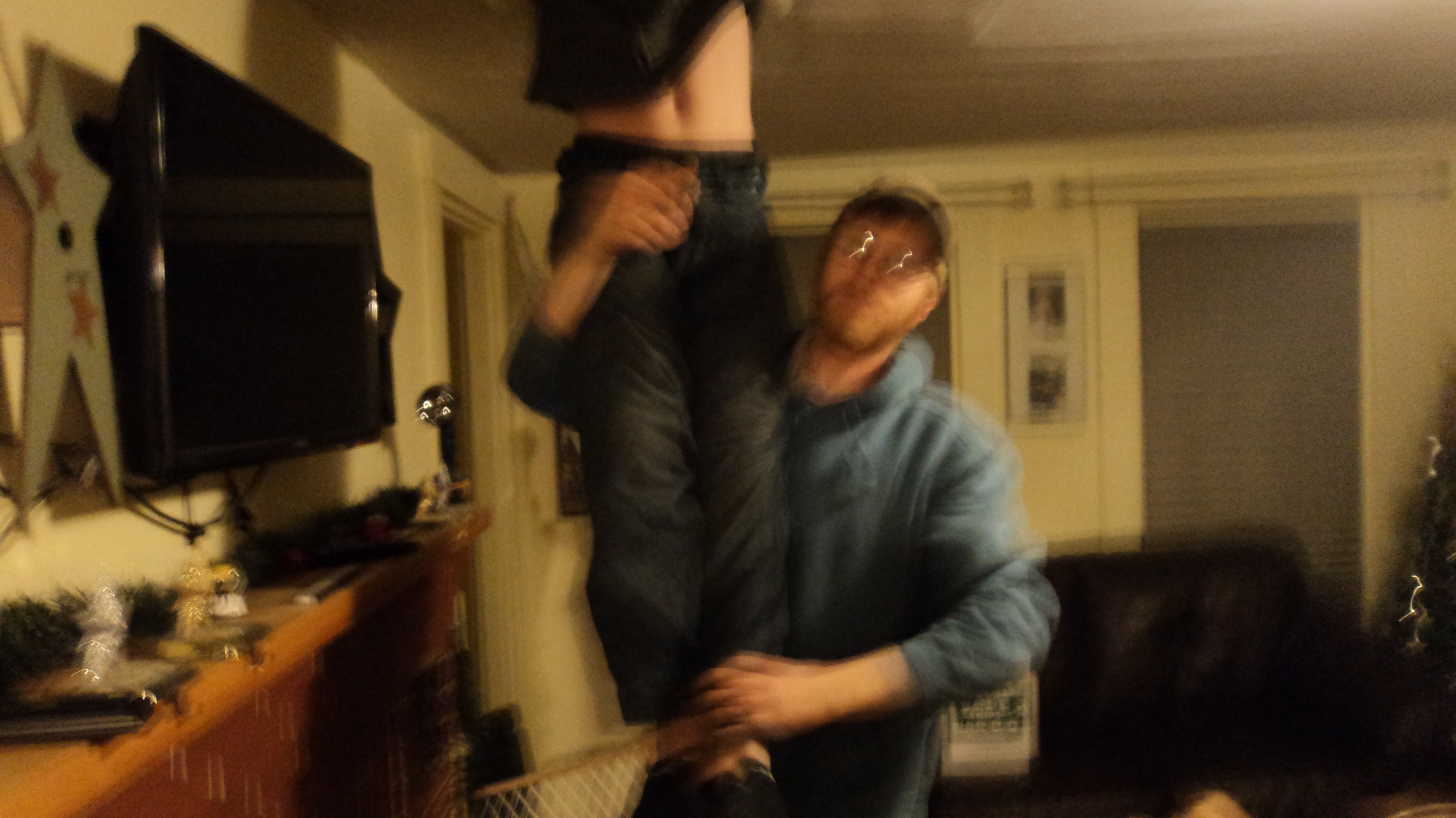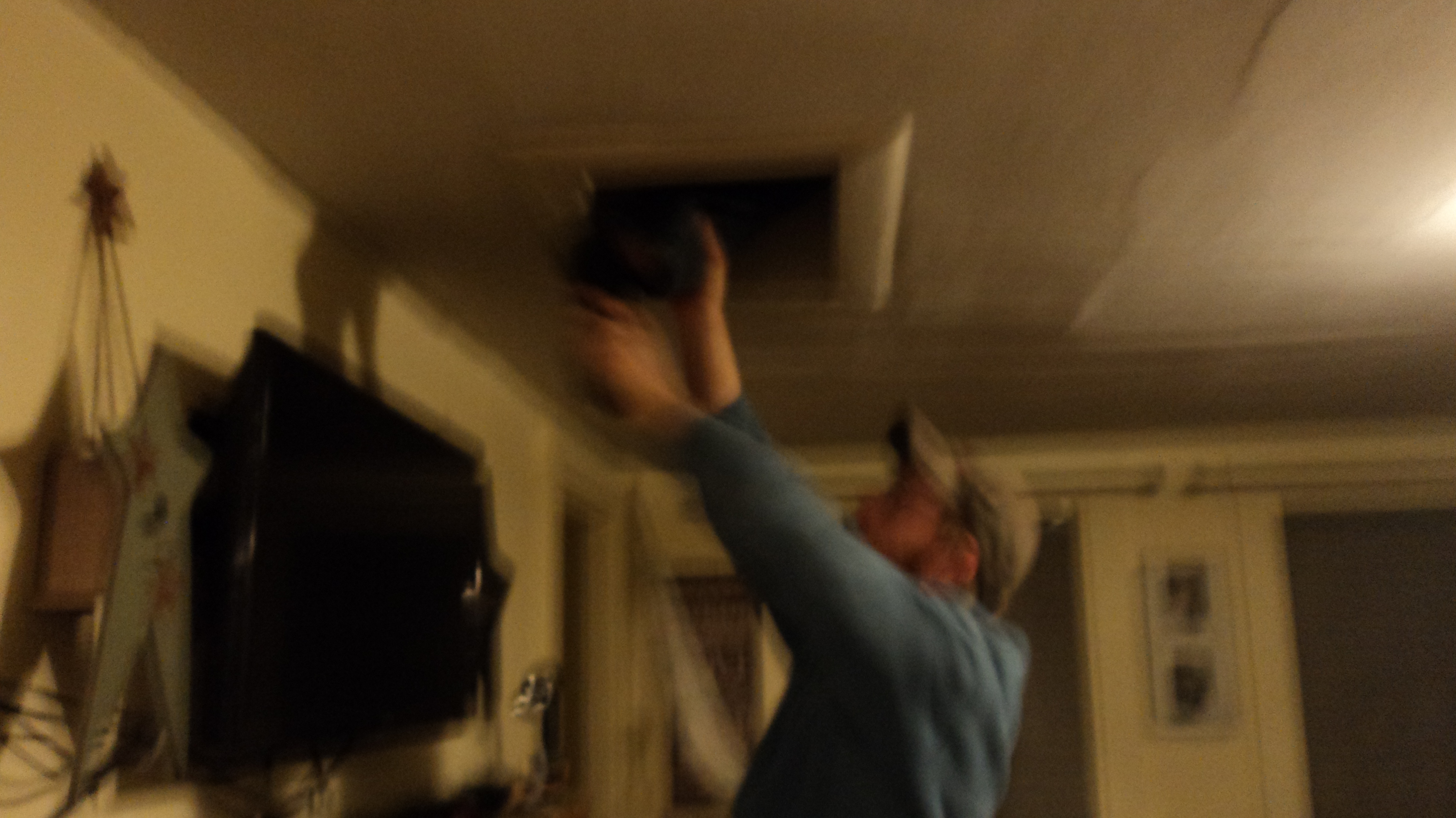 And the after-dinner shenanigans. Oy. That project I was talking about? The stairs and upstairs hallway are covered in polyurethane and someone left the radio on upstairs. We had to put Colby through the drop vent to turn it off . . .